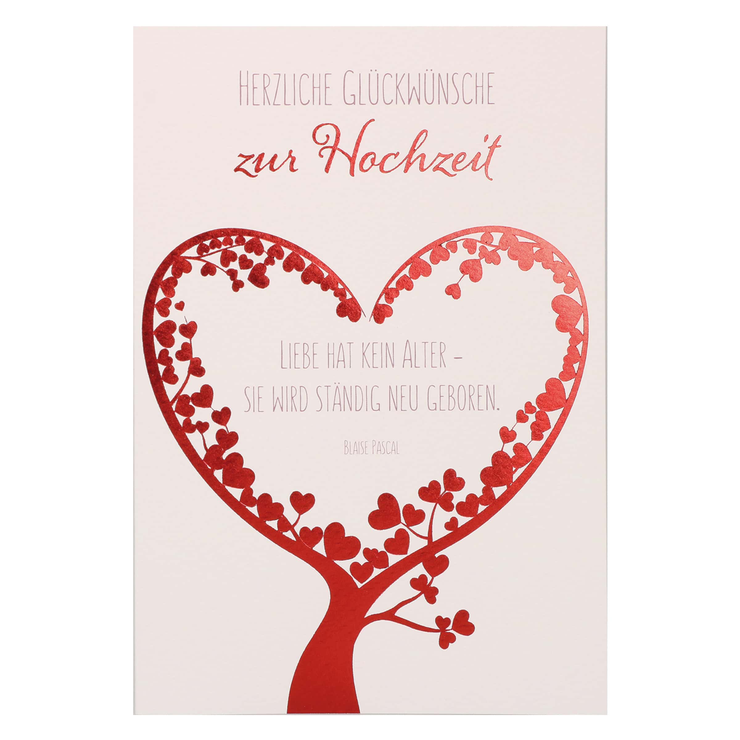 Diese elegante Hochzeitskarte übermittelt Ihre Glückwünsche zur Vermählung auf besonders stilvolle Weise. Mit einem zarten Design, hochwertigem Naturpapier und einer edlen Folienprägung ist sie ein echter Blickfang. Der berührende Spruch von Blaise Pascal verleiht der Karte eine zeitlose Tiefe und unterstreicht die Bedeutung der Liebe, die niemals vergeht.