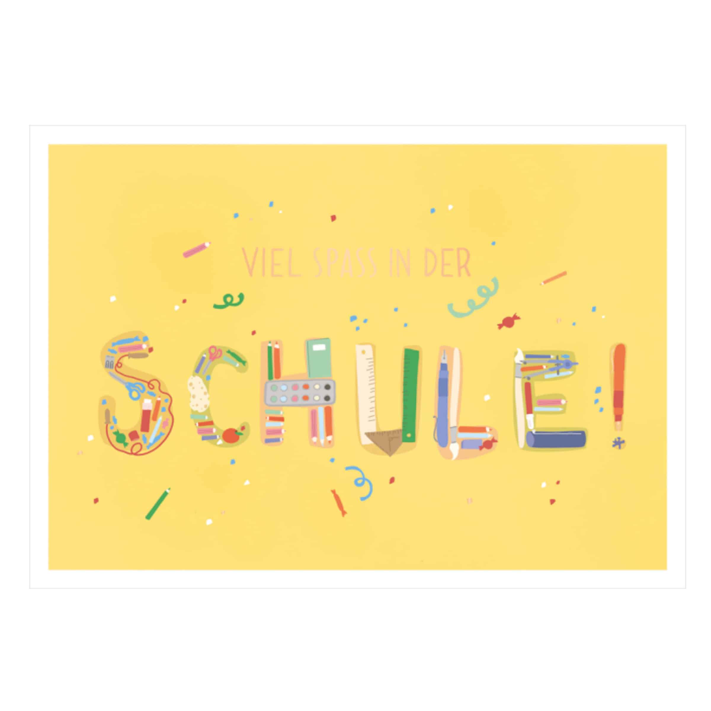 Mit dieser farbenfrohen Grußkarte beginnt das Abenteuer Schule auf die schönste Weise! Die gelbe Vorderseite mit fröhlichem Konfetti-Muster und bunter Schrift sorgt sofort für gute Laune – genau das Richtige, um einem Schulkind Mut zu machen und Vorfreude zu schenken.