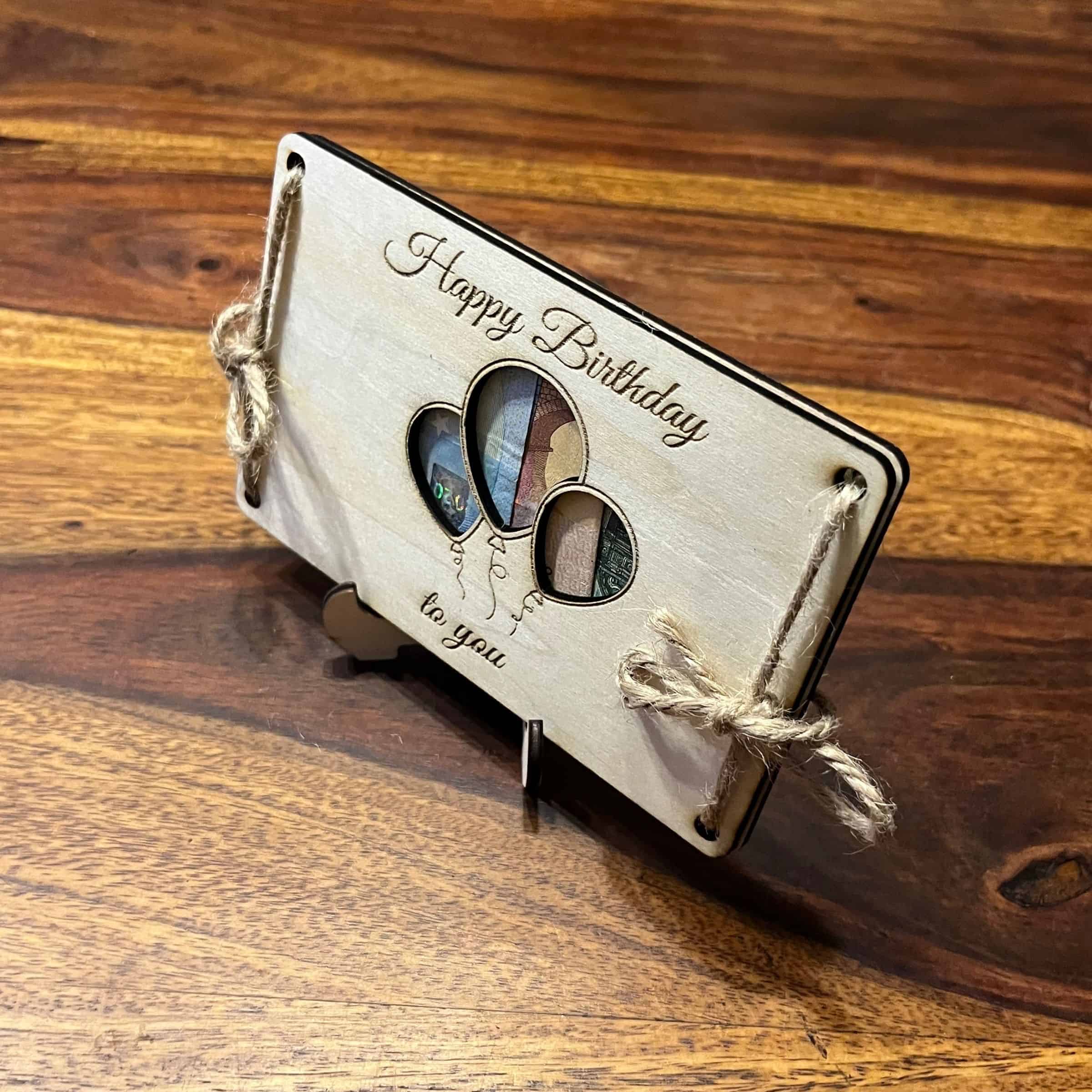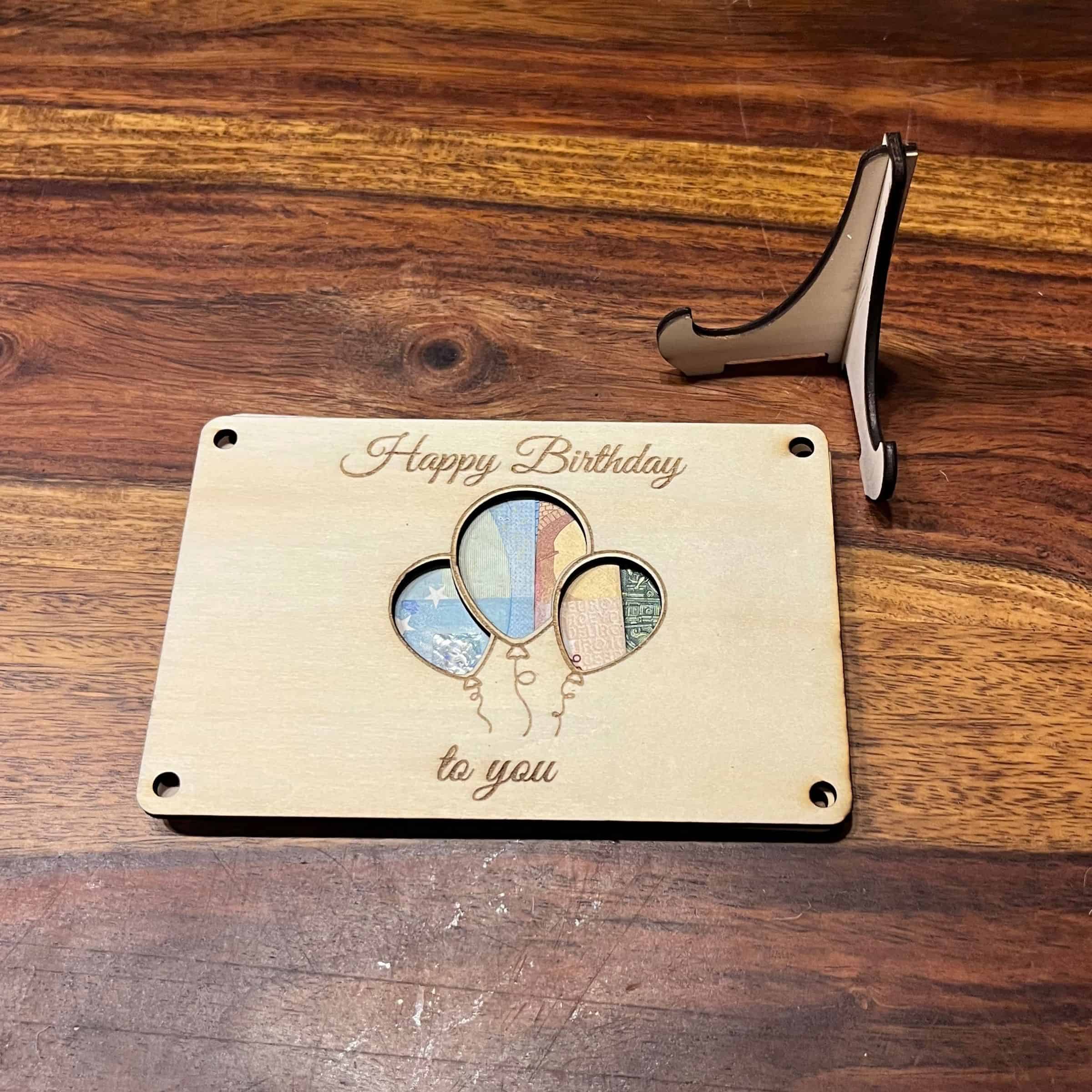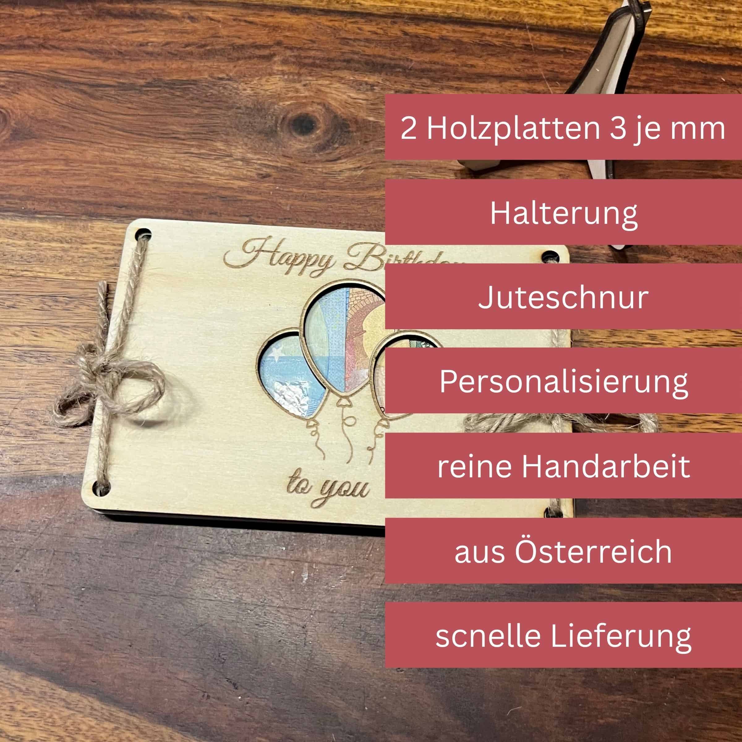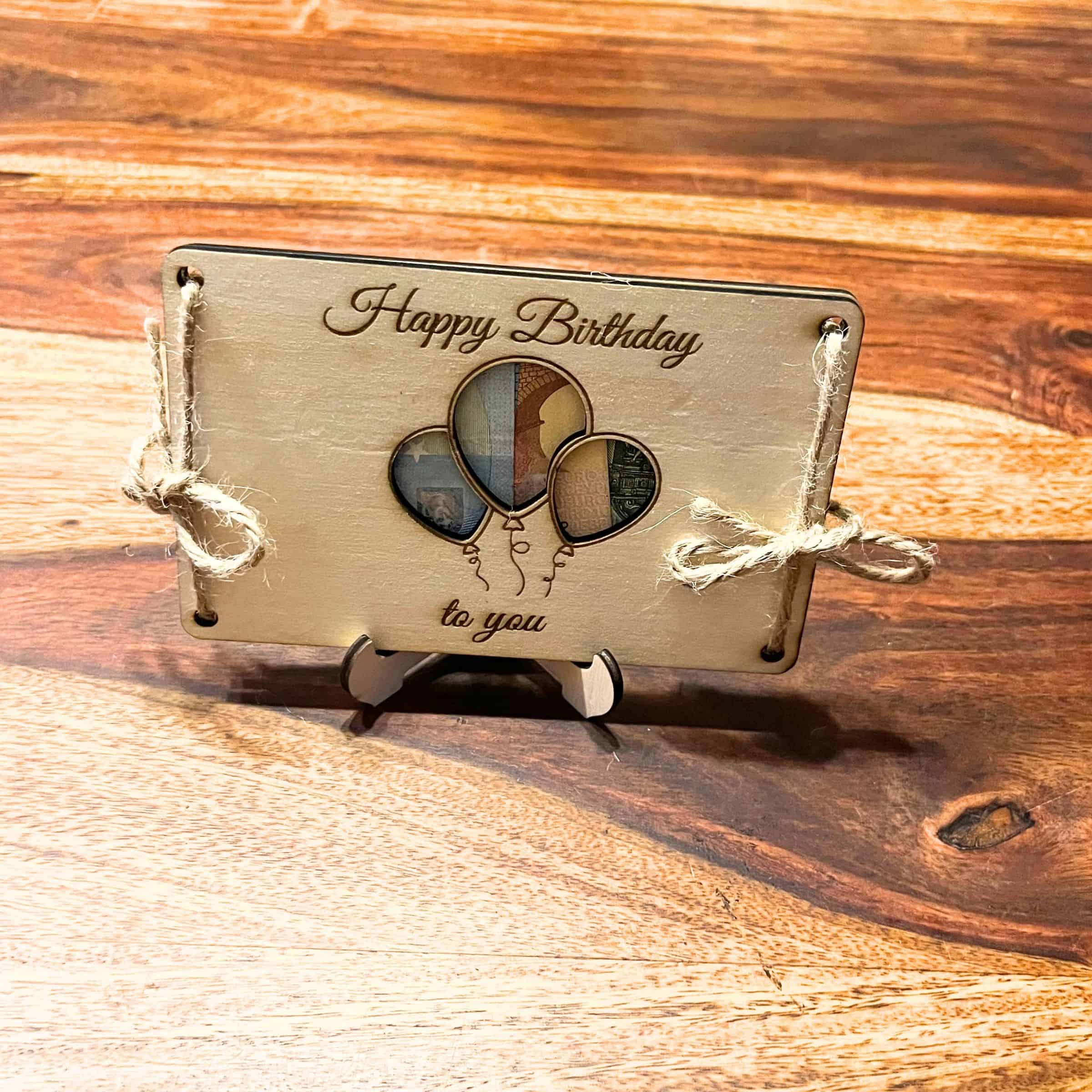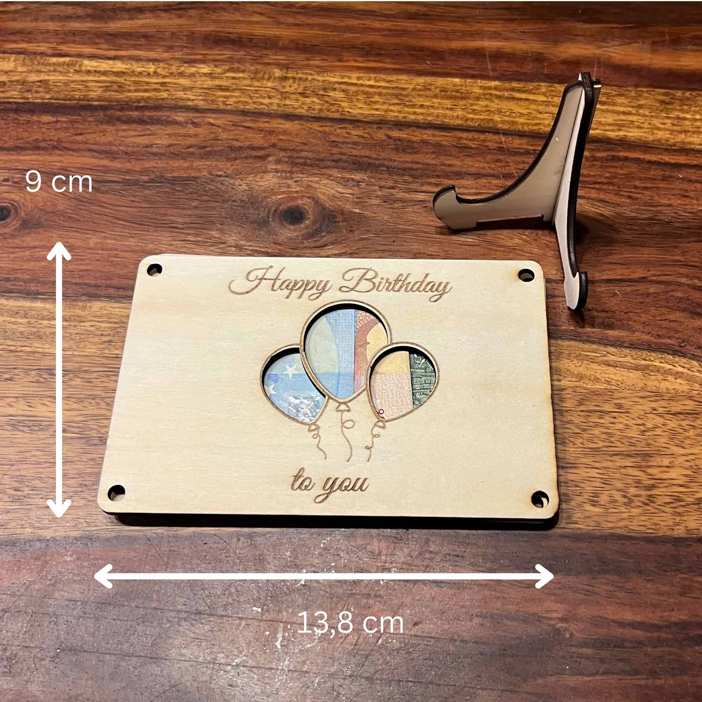 Diese kleine Holz-Geldgeschenkkarte zum Geburtstag ist eine liebevolle Möglichkeit, Geld auf besondere Weise zu verschenken. Der Schriftzug „Happy Birthday to you“ und die drei Ballons stehen für Freude, Leichtigkeit und einen ganz besonderen Ehrentag.