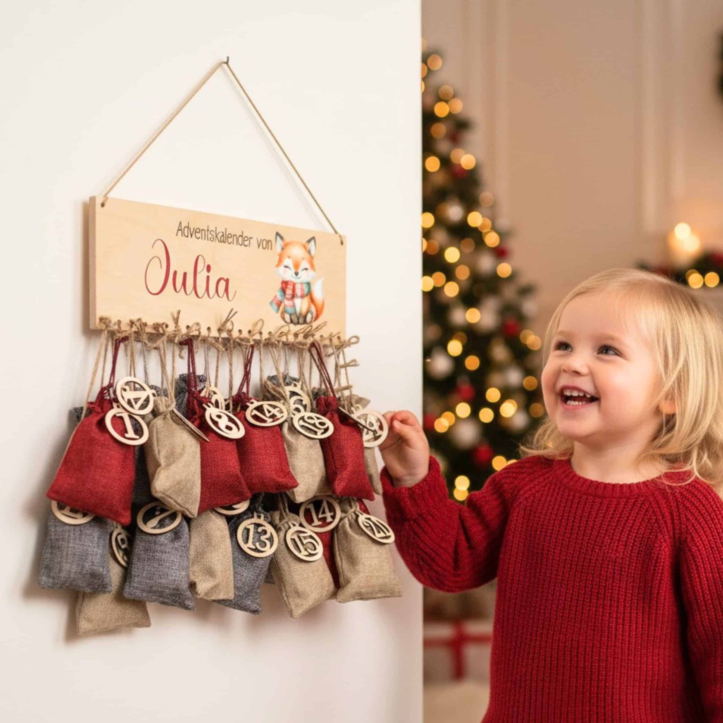 Dieser personalisierte Adventskalender mit Fuchs-Motiv verleiht der Adventszeit eine ganz besondere, warme Note.