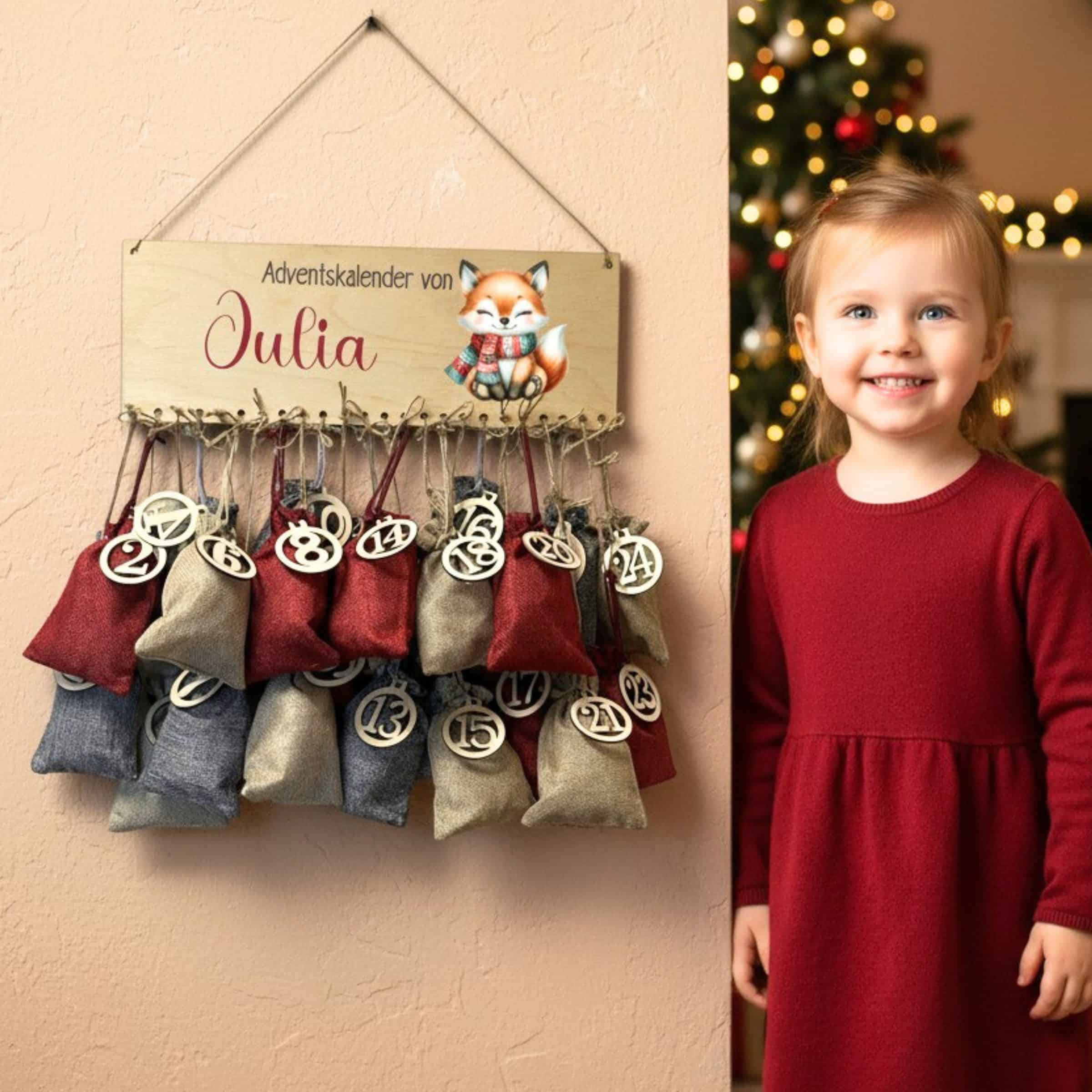 Zauberhafter Adventskalender zum Aufhängen mit süßem Fuchs-Motiv und personalisiertem Namen.