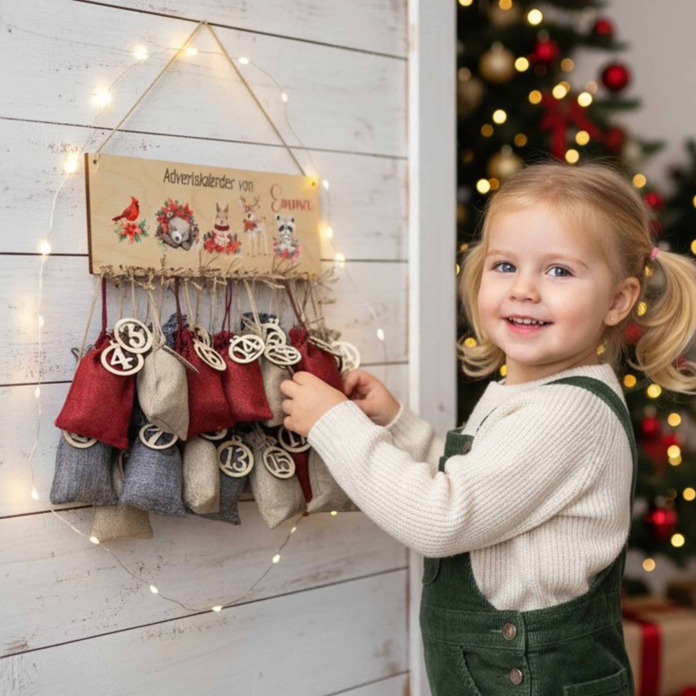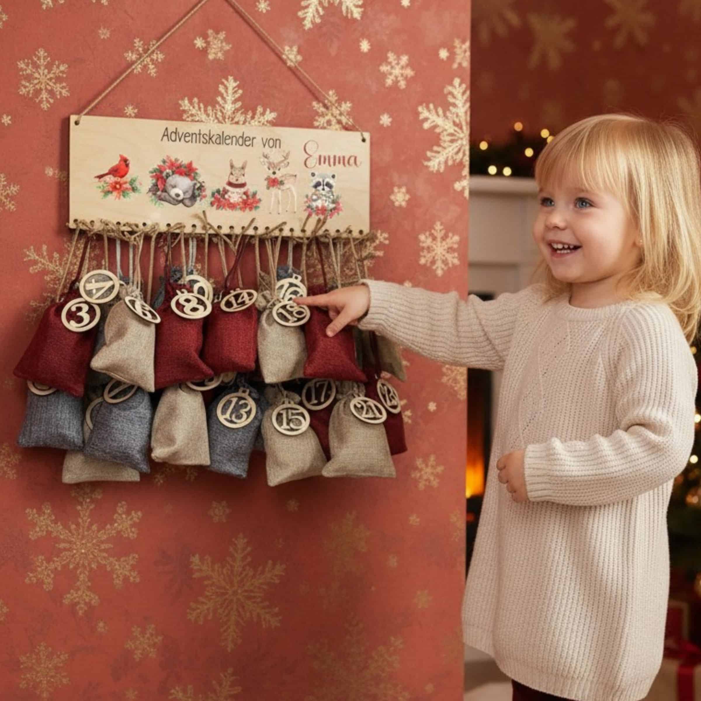 Dieser personalisierte Adventskalender mit Waldtieren und Weihnachtsstern verleiht der Adventszeit eine ganz besondere, warme Note.