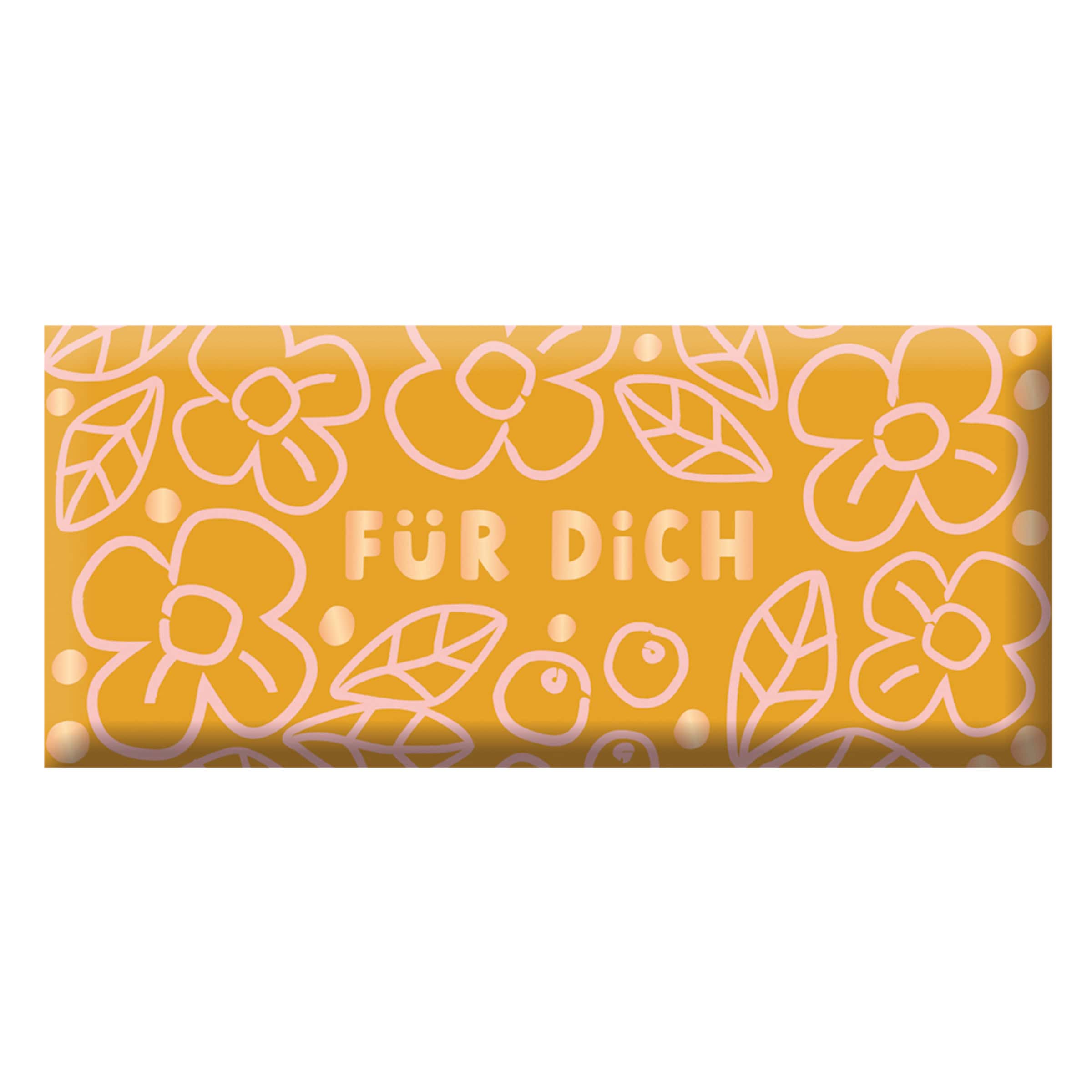 Diese leckere Vollmilchschokolade in einer fröhlichen Verpackung mit orangem Hintergrund und zarten weißen Blumen ist das perfekte kleine Geschenk, um einfach mal „Danke“ oder „Ich denk an dich“ zu sagen.